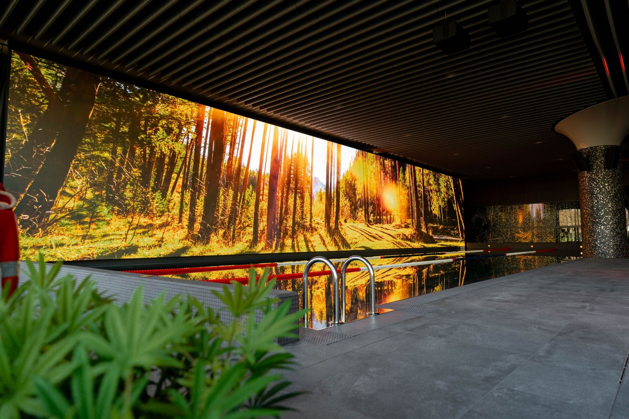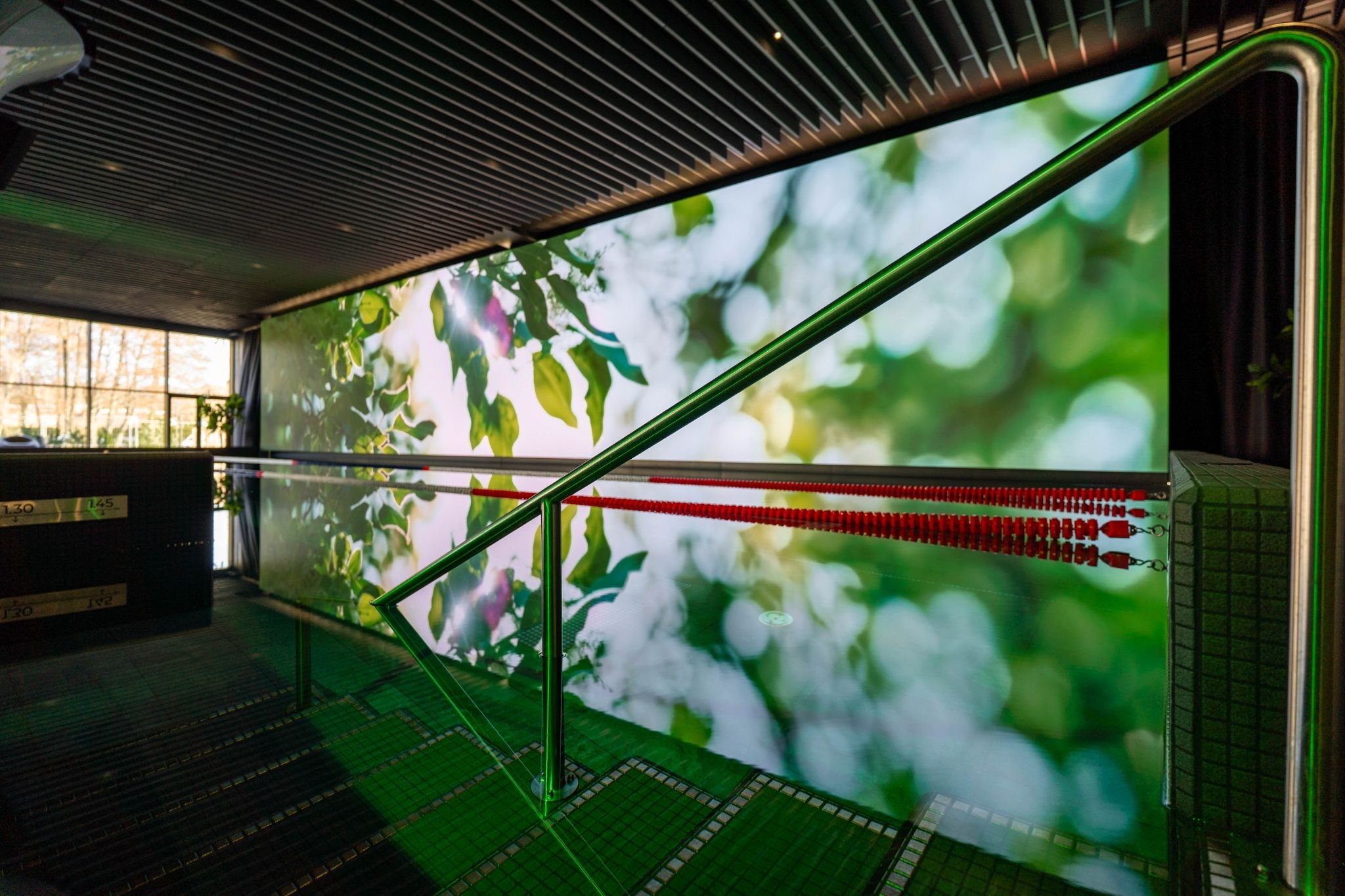 The main highlight of the new area is a 25-meter-long LED screen – the only one of this size and quality next to a pool in Lithuania. Its total area is 112.5 m². The screen was made by Unilumin, one of the largest LED screen manufacturers in the world. The solution was designed by Hansab experts, who carefully adapted it to the specific conditions of a pool area. The screen uses highly durable components, made to withstand even tough outdoor environments, ensuring long-lasting and reliable operation.