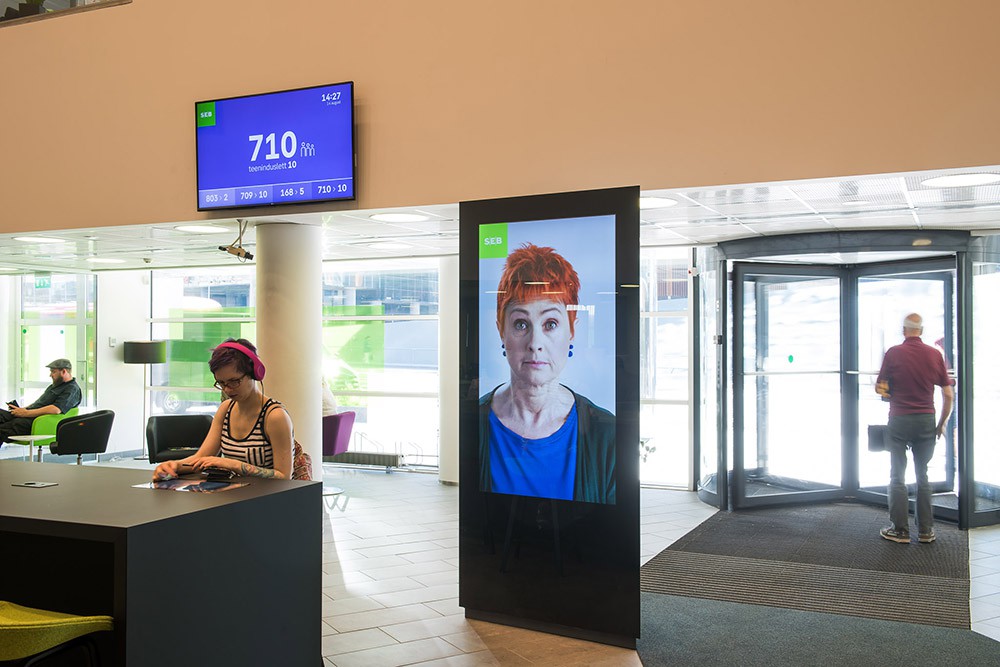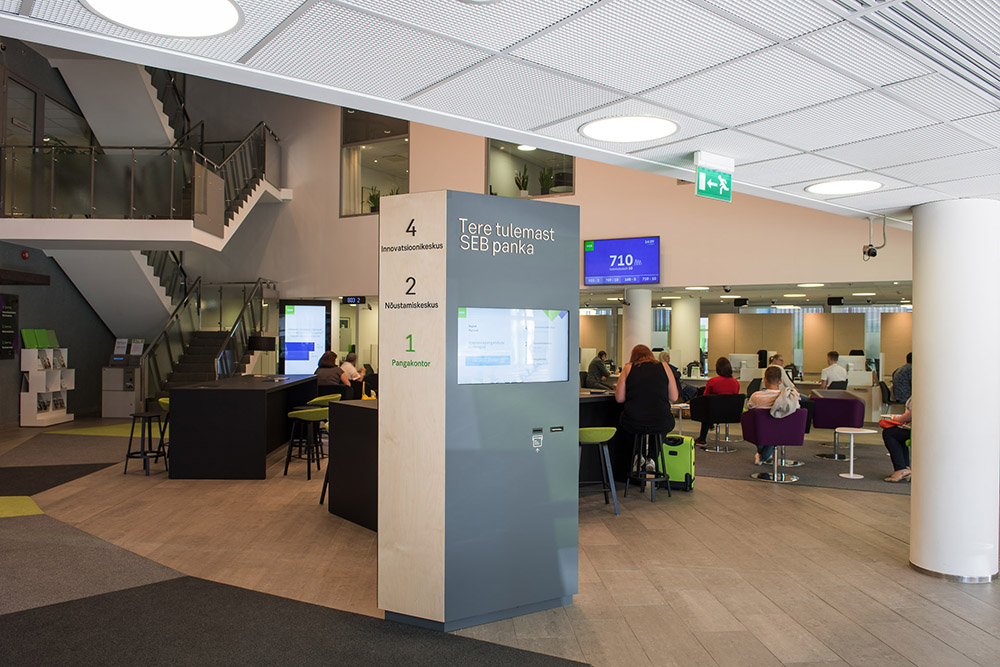 SEB chose Hansab as a technology partner, and Hansab supplied and installed all the digital displays, sound system and extension of the customer flow management system to customer service area. The operation of all the displays and the sound system can be controlled from tablet PCs, a very user-friendly approach.