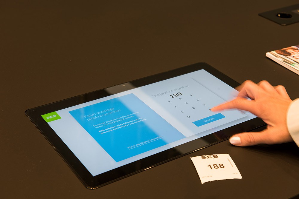 The customer flow management system was upgraded to the Q-Matic Orchestra platform, which, thanks to its extensive integration capabilities, helps to create a modern, customer-friendly service environment. The Elo touch touchscreens that are connected to the queuing system have been integrated into the customer waiting area tables. Through integration, customers have the opportunity to enter their waiting number to the screen and thus have the opportunity to keep an eye on their queue and at the same time to see information provided by the bank.