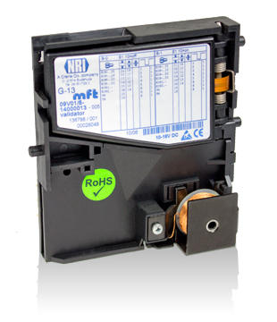 The NRI G-13.mft is the market leading 3.5" coin validator. This popular coin validator is used in applications with standard coin acceptance speed requirements such as AWP and casino machines, table-top vending machines, carwash or laundry applications or you can choose the battery version for parking machines.